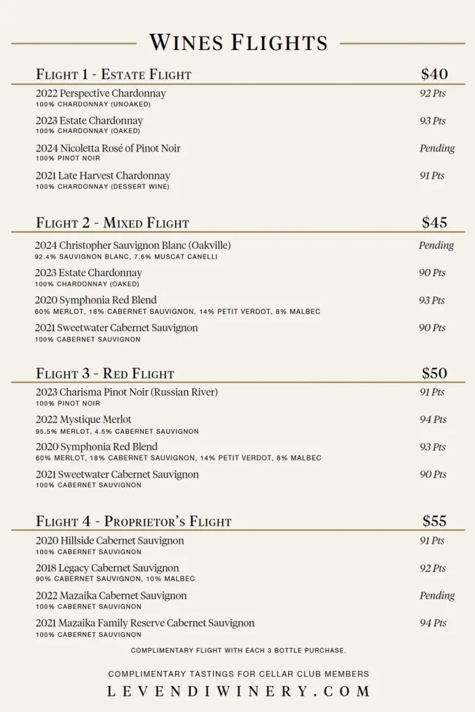 Levendi Tasting Room Menus Wine Flights